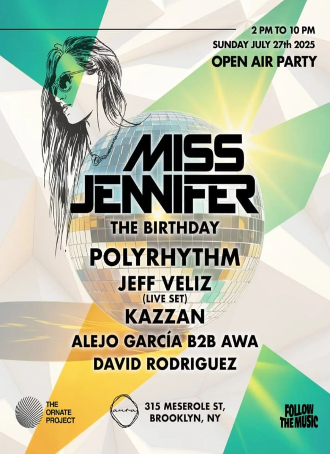 Join us for our first OPEN AIR, Follow The Music Event on 7/27, with MISS JENNIFER, Polyrhythm, Jeff Veliz & More!